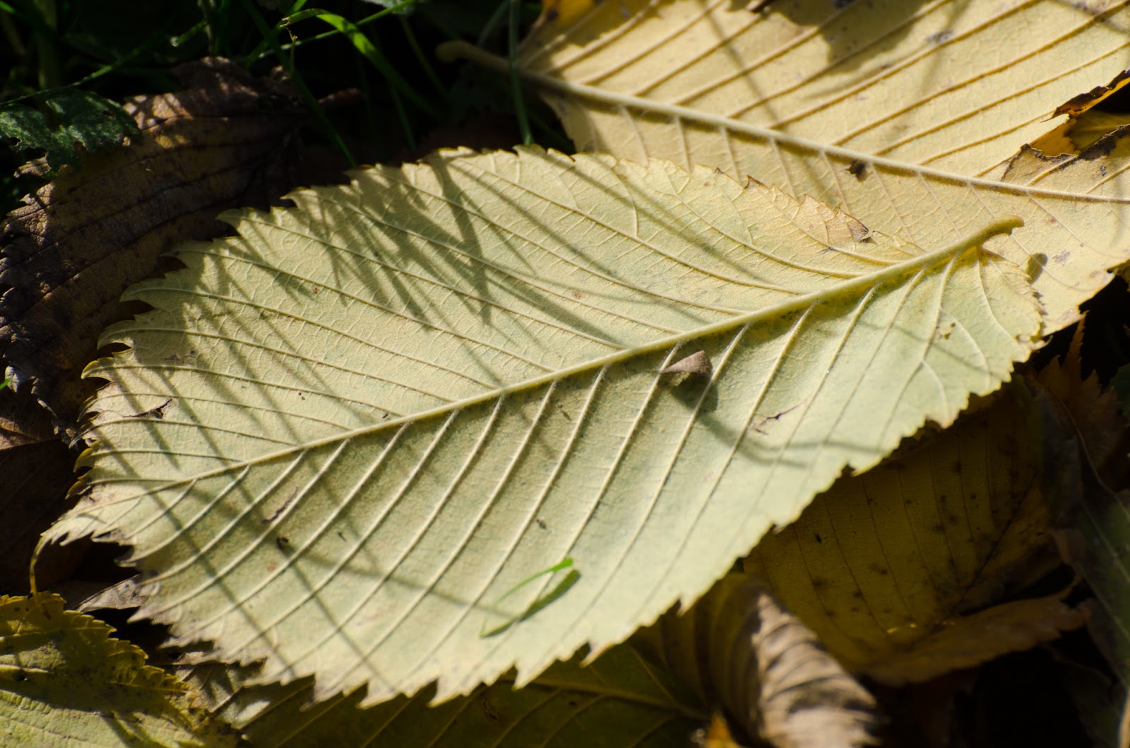 Die großenteils leuchtend gelben Herbstblätter der Flatterulme - Ulmus laevis - haben durch ihre Asymmetrie eine besonders auffällige Form; das Bild der Blattunterseite wirkt besonders durch die stark hervortretende Nervatur.